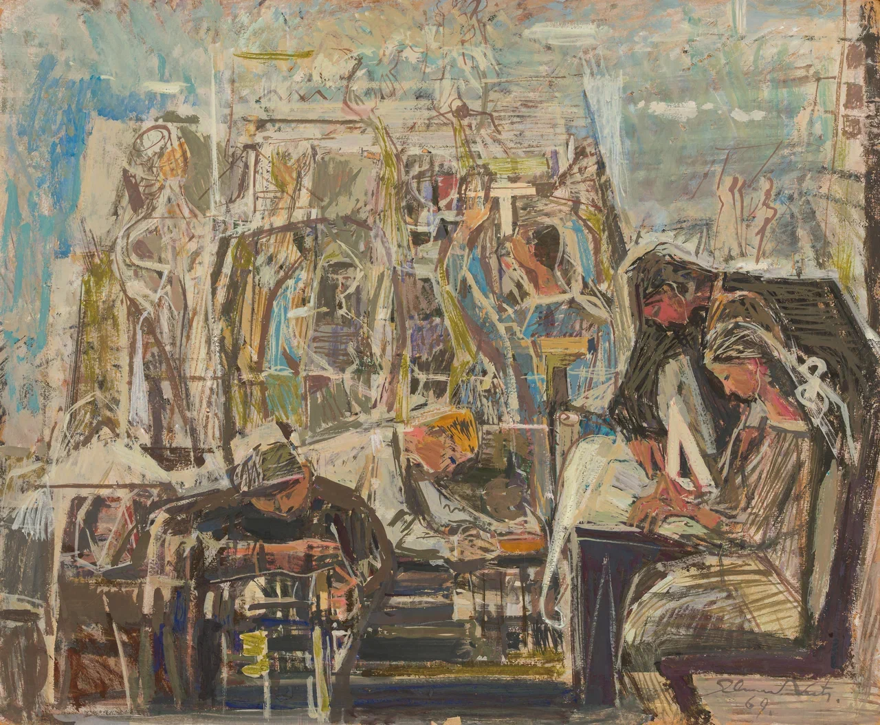Notable 1950s portraits include “Professor I. V. Veski” (1952) and his “Self-Portrait” (1956). The 1960s brought experimentation: the triptych “Music—Ballet—Fine Art” (1961–1962) and abstract works like “Trio” (1964). His 1969 canvas “V. I. Lenin” capped the decade.