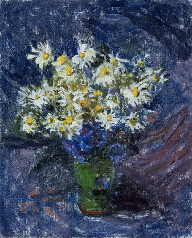 The painting “Daisies” by Linda Kits-Mägi depicts a lively bouquet of white daisies and blue wildflowers arranged in a green vase. The flowers stand out against a dark, textured blue background, creating a vivid contrast. The loose, expressive brushwork captures the freshness and spontaneity of nature, giving the composition a sense of movement and lightness.