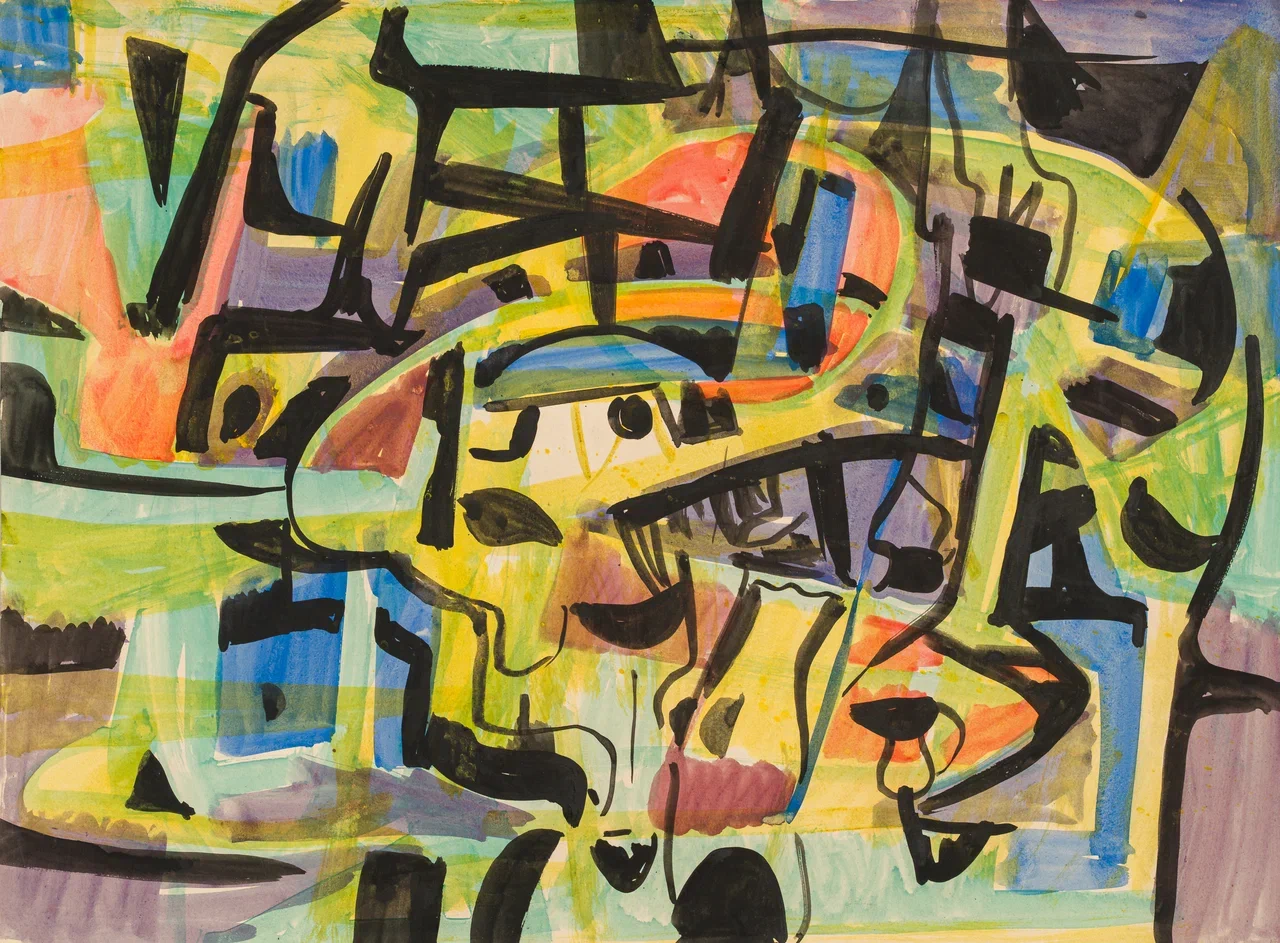Elmar Kits’s work “Decorative” presents an abstract-decorative composition of interwoven organic forms and color patches. The palette is built on a combination of rich warm and cool tones — ochre, emerald, blue, and red — flowing into one another through the wet-on-wet watercolor technique. The forms suggest stylized plant motifs or fragments of ornamentation but do not coalesce into a concrete representational image, remaining on the boundary between decoration and abstraction. The lightness and transparency of the watercolor contrasts with the dense, rhythmically saturated composition, characteristic of Kits’s decorative experiments. The work demonstrates the artist’s freedom and mastery in handling color and form beyond the confines of figurative painting.