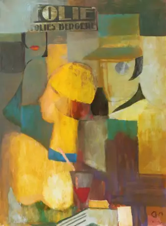 In this abstract work by Indulis Zarins, blocks of yellow, green, and brown blend together to form overlapping silhouettes and faces, suggesting a bustling café or social scene. The use of bold colors and dynamic shapes gives the painting a sense of movement and complexity, inviting viewers to interpret the connections and emotions hidden within the fragmented imagery. The subtle hints of text and objects further add to its urban, contemporary atmosphere.