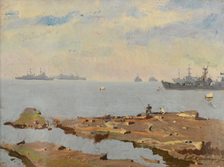 The painting “Ships” shows a tranquil seascape with several ships quietly anchored in the distance beneath a pale, cloud-filled sky. In the foreground, a rocky shoreline extends into the water, where a solitary fisherman sits, casting a line, and a small boat rests nearby. The calm mood and subtle colors evoke a sense of quiet contemplation and peaceful maritime life.